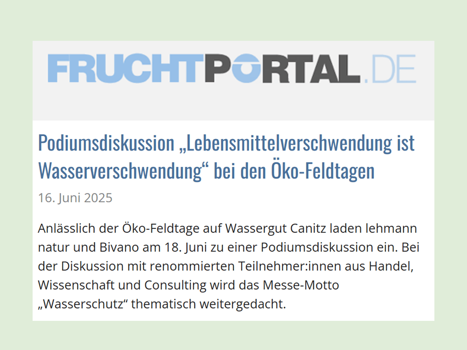 Anlässlich der Öko-Feldtage auf Wassergut Canitz laden lehmann natur und Bivano am 18. Juni zu einer Podiumsdiskussion ein. Bei der Diskussion mit renommierten Teilnehmer:innen aus Handel, Wissenschaft und Consulting wird das Messe-Motto „Wasserschutz“ thematisch weitergedacht. FRUCHTPORTALl berichtet.